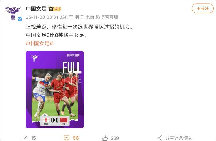 北京时间11月30日凌晨1时30分,2025年足球友谊赛在温布利大球场展开角逐,中国女足客场对阵英格兰女足。上半场中国女足11分钟连丢4球,李梦雯手球送点,下半场斯坦维帽子戏法,女足后场玩火送礼。最终中国女足客场0比8惨败英格兰女足,女足全场遭压制,控球仅3成+6射门2射正。