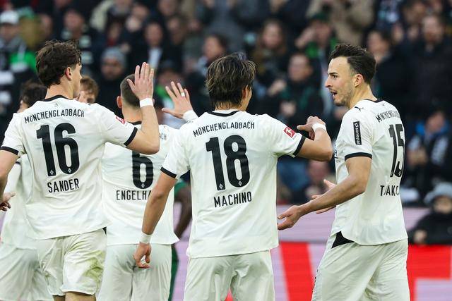 ↑ 门兴格拉德巴赫队球员庆祝得分。