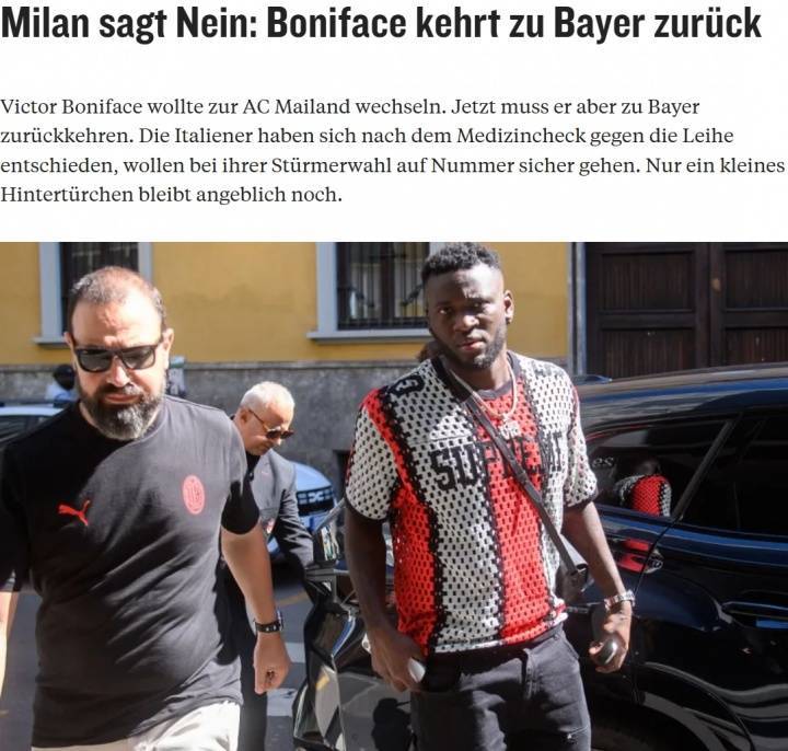 米兰与药厂原本已就一项包含买断条款的租借协议达成一致,据悉为500万欧租借外加2400万欧买断。但在博尼法斯接受意大利方面安排的强制体检后,这笔交易最终被AC米兰否决,博尼法斯因此不得不返回德国。